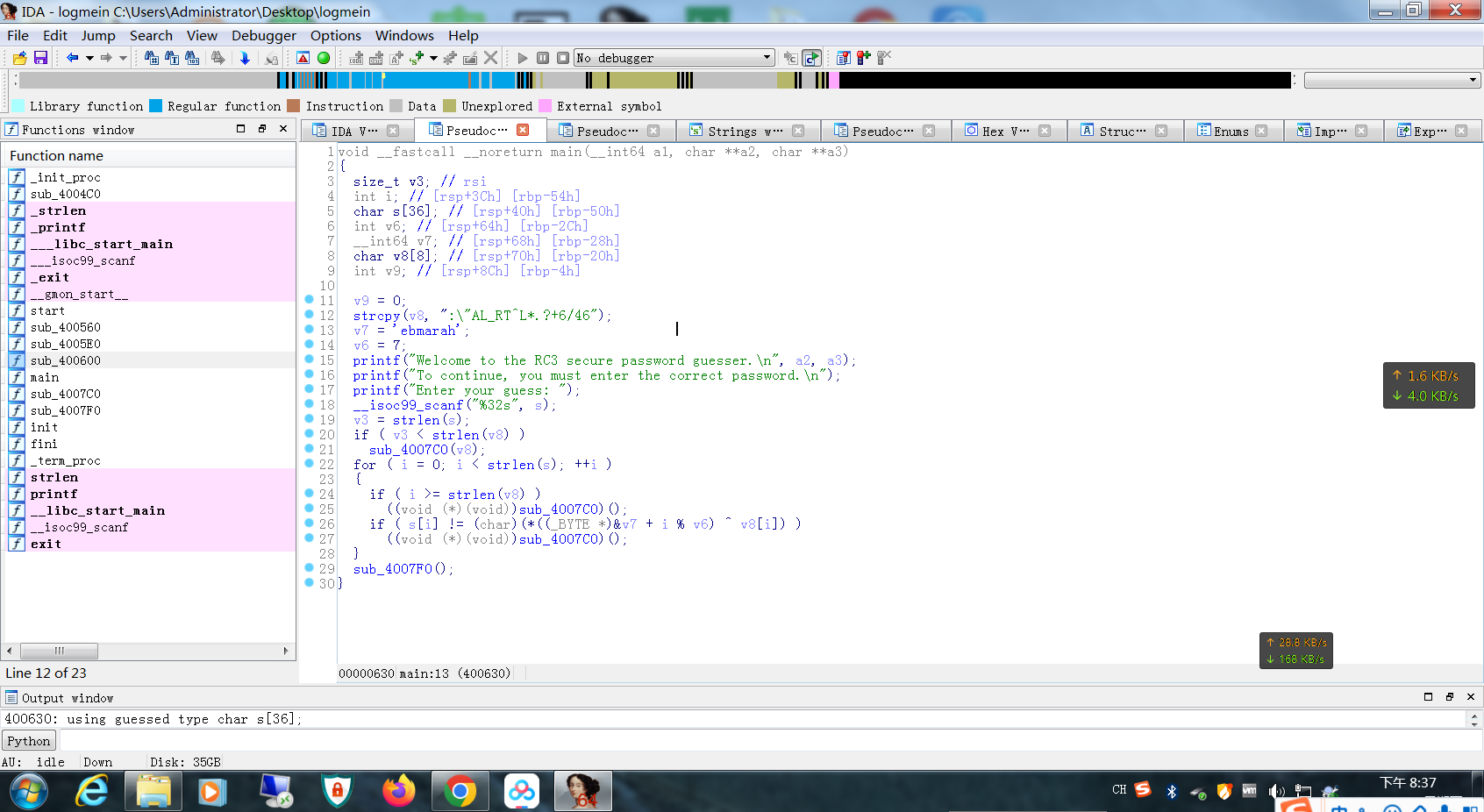 defmain(): v9 = 0 v8 = ":\"AL_RT^L*.?+6/46" v7 = "ebmarah" v6 = 7 print("Welcome to the RC3 secure password guesser.") print("To continue, you must enter the correct password.") print("Enter your guess: ", end="") guess = input() v3 = len(guess) if v3 < len(v8): sub_4007C0(v8) for i inrange(len(guess)): if i >= len(v8): sub_4007C0() if guess[i] != chr(ord(v7[i % v6]) ^ ord(v8[i])): sub_4007C0() sub_4007F0()