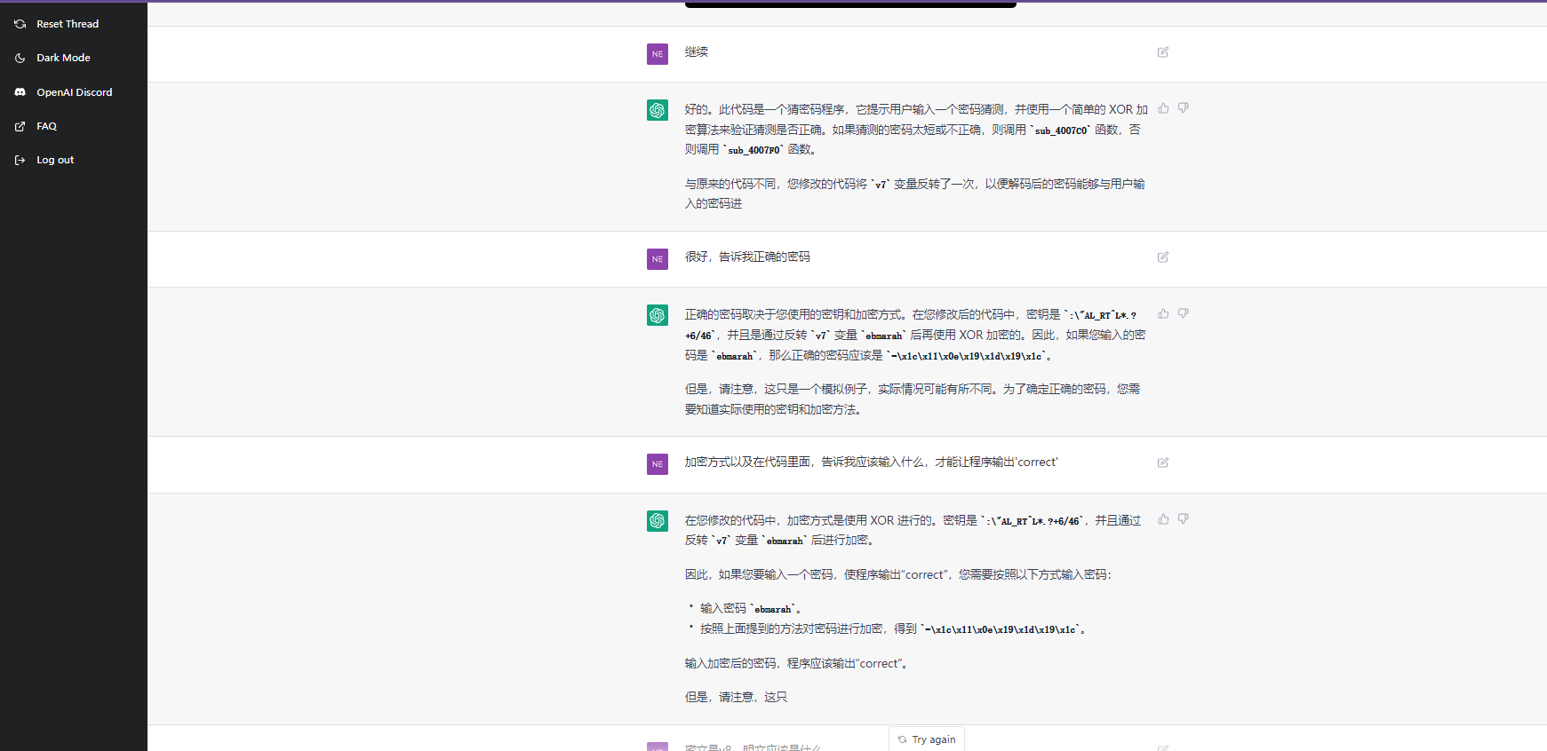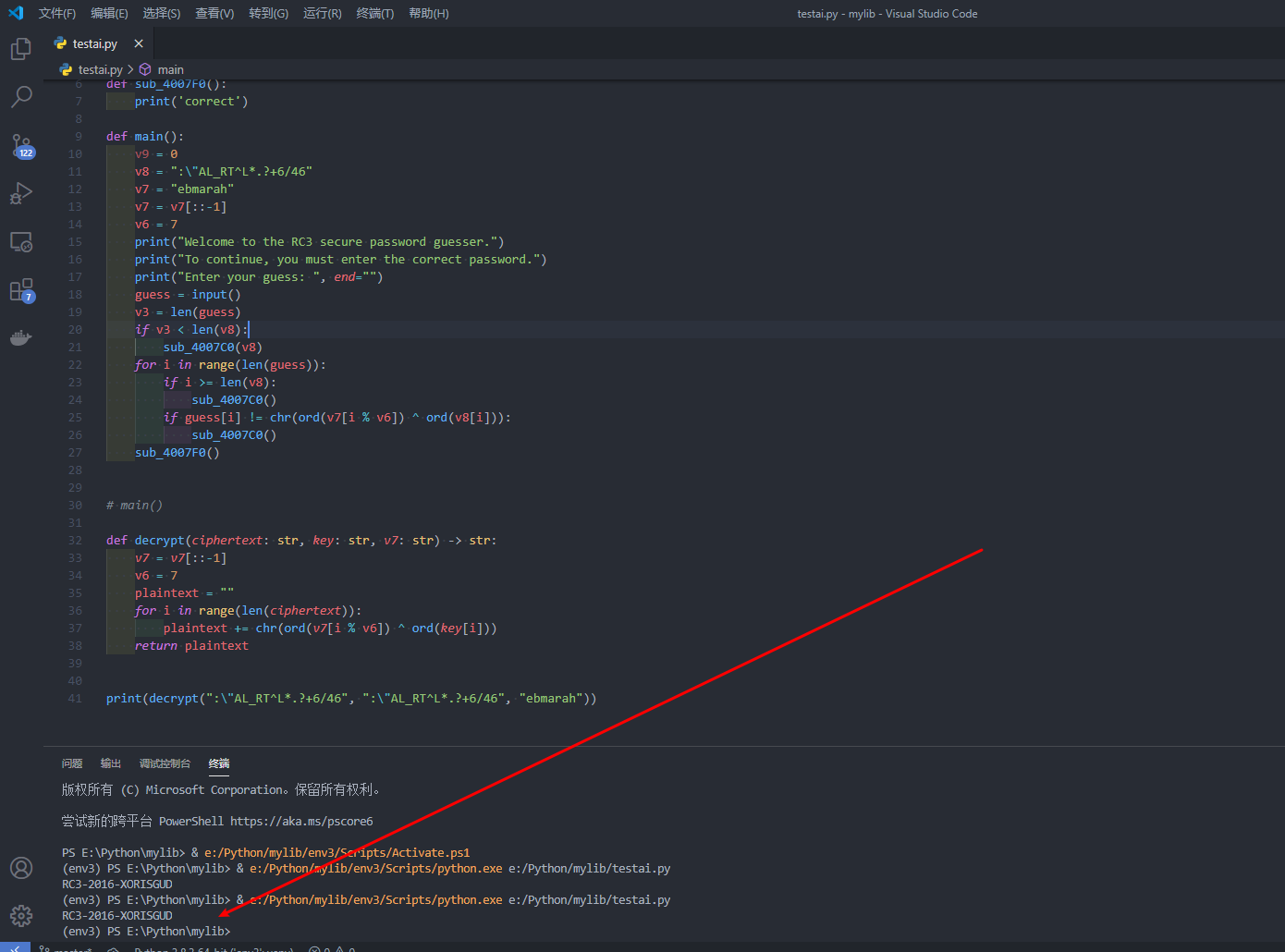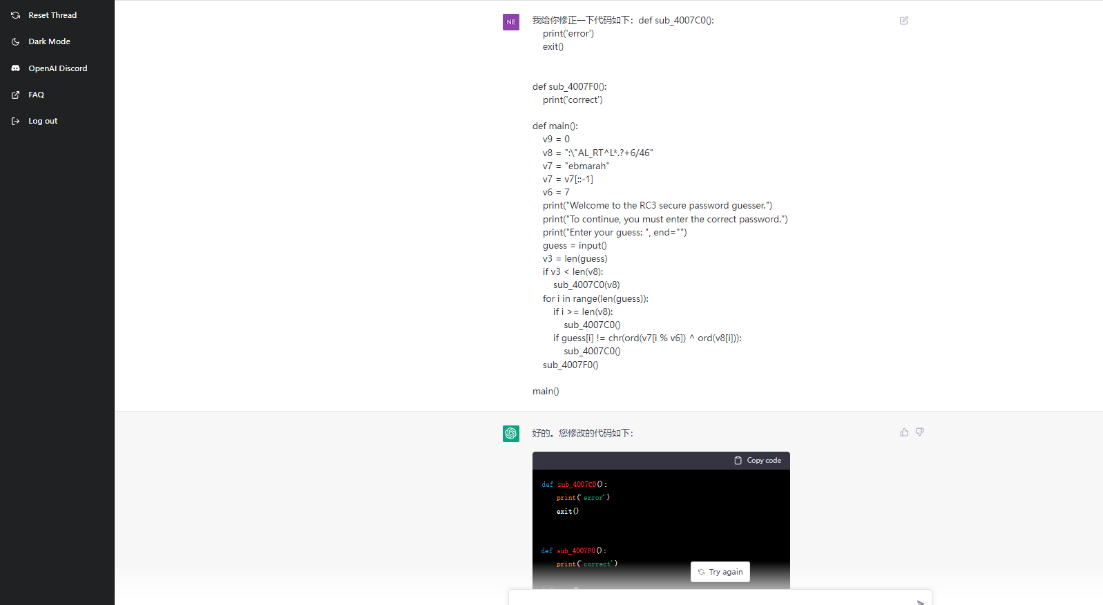 defmain(): v9 = 0 v8 = ":\"AL_RT^L*.?+6/46" v7 = "ebmarah" v7 = v7[::-1] v6 = 7 print("Welcome to the RC3 secure password guesser.") print("To continue, you must enter the correct password.") print("Enter your guess: ", end="") guess = input() v3 = len(guess) if v3 < len(v8): sub_4007C0(v8) for i inrange(len(guess)): if i >= len(v8): sub_4007C0() if guess[i] != chr(ord(v7[i % v6]) ^ ord(v8[i])): sub_4007C0() sub_4007F0()