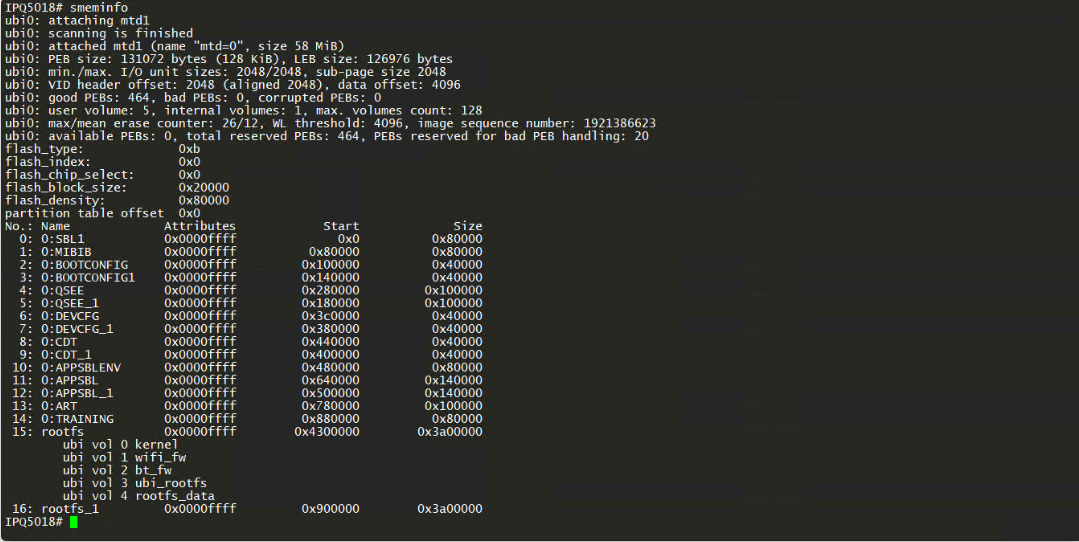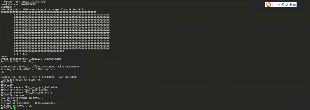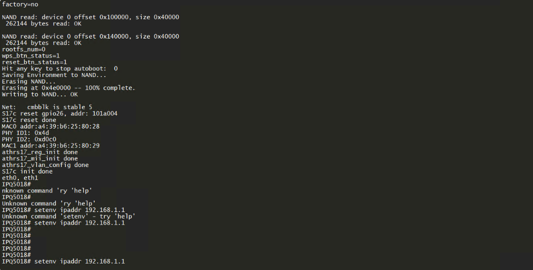 插电后TTL开始滚屏,瞬间狂按esc,手速要快,基本要开机前2秒内完成,成功后会出现IPQ5018#字样: