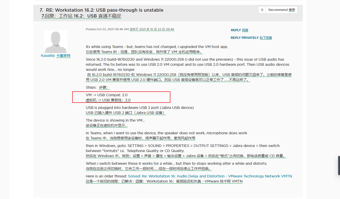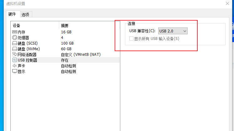 Vmware Workstation 17 USB直通不识别 发表于 2024-11-18 更新于 2024-11-27 分类于 折腾 阅读次数: 前言最近从Vmware Workstation 16.2升级到17.6,发现USB直通之后无法连接设备,搜索一番后成功解决问题。 正文因为工作需要,经常需要桥接USB到虚拟机,最近升级之后发现有问题,桥接进去设备管理器看不到,打开相应软件也不识别。 尝试过在vmx配置文件增加这个设置,无用。 1usb.generic.keepStreamsEnabled = "FALSE" 最终通过修改USB兼容性成功解决问题。 参考https://community.broadcom.com/communities/community-home/digestviewer/viewthread?GroupId=7171&MessageKey=d892fc9b-0132-4281-a96c-062474877675&CommunityKey=fb707ac3-9412-4fad-b7af-018f5da56d9f 本文作者: r0yanx 本文链接: https://r0yanx.com/2024/11/18/Vmware-Workstation-17-USB直通不识别/ 版权声明: 本博客所有文章除特别声明外,均采用 BY-NC-SA 许可协议。转载请注明出处!