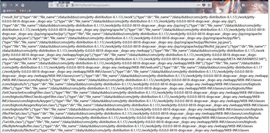 - 蒙了一下dirFiles.jsp的参数,发现使用path作为参数名可列出目录、文件信息,URL:http://x.x.x.x:28076/file/dirFiles.jsp?path=.![]()