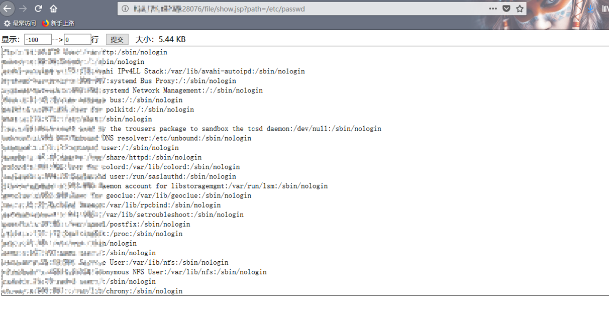 - 同样的方法,发现show.jsp存在任意文件读取漏洞,URL:http://x.x.x.x:28076/file/show.jsp?path=/etc/passwd![]()