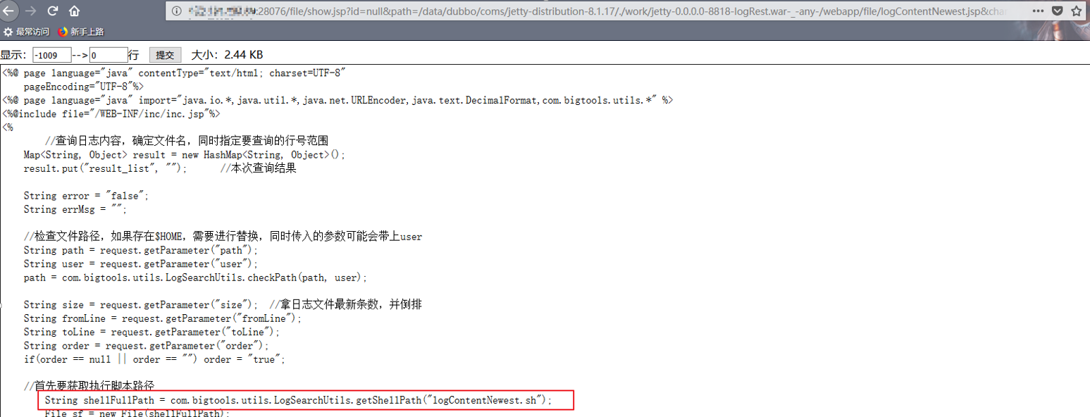 - 结合上面的目录信息和任意文件读取漏洞,对JSP文件简单审计一下,发现logContentNewest.jsp会调用一个bash脚本,便猜想能否使用它构造命令执行:![]()
