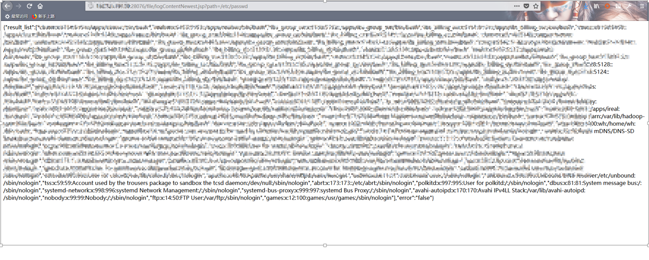 - logContentNewest.jsp正常执行是这样的,可自定义- path参数的值,如- /etc/passwd,来查找这个文件里面的内容:![]()