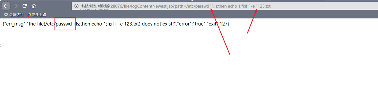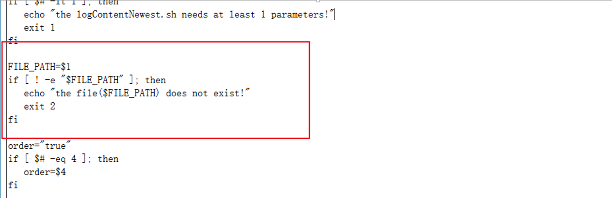 - 分析logContentNewest.jsp和被调用的sh脚本,得知path参数最终会传入sh脚本的FILE_PATH变量,然后调用下面的判断逻辑。从下面代码我们可以看到,函数的功能是判断FILE_PATH变量的值是否存在,而这个变量的值目前是可控的![]()
