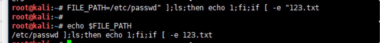 - 命令结果的回显是因为判断不存在FILA_PATH文件名的文件后,会把变量值返回,其源码如下:拓展知识: Linux bash中可以使用反引号1 echo "the file($FILE_PATH) dose not exist!" `或者$()等方式将bash命令的执行结果保存到变量中,如FILE_PATH=$(ifconfig)