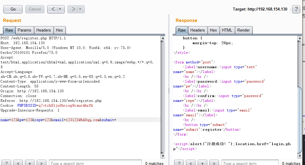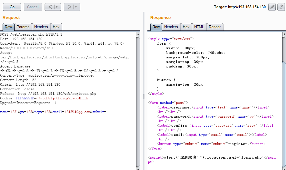 题目中的登陆页面、注册页面均无SQL注入漏洞,但是登陆后的主页在用户名处存在SQL注入漏洞。要利用此漏洞,需要在注册页面控制用户名,邮箱使用随机数生成的邮箱,密码随意,然后使用邮箱和注册时的密码登陆,登陆成功后跳转到主页,此时触发SQL注入漏洞。