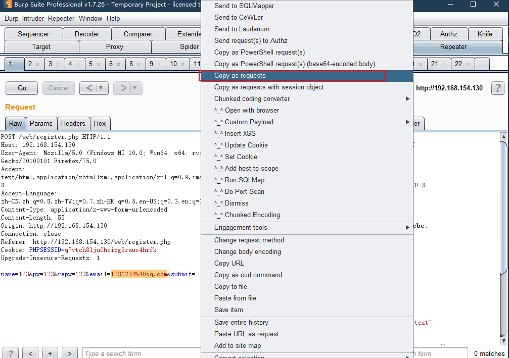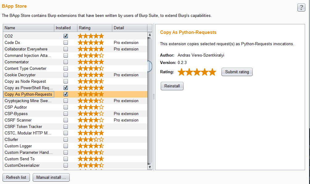 这里说一个小技巧,可以使用Burp的拓展Copy As Python-Requests来一键把burp的请求复制为Python requests请求: