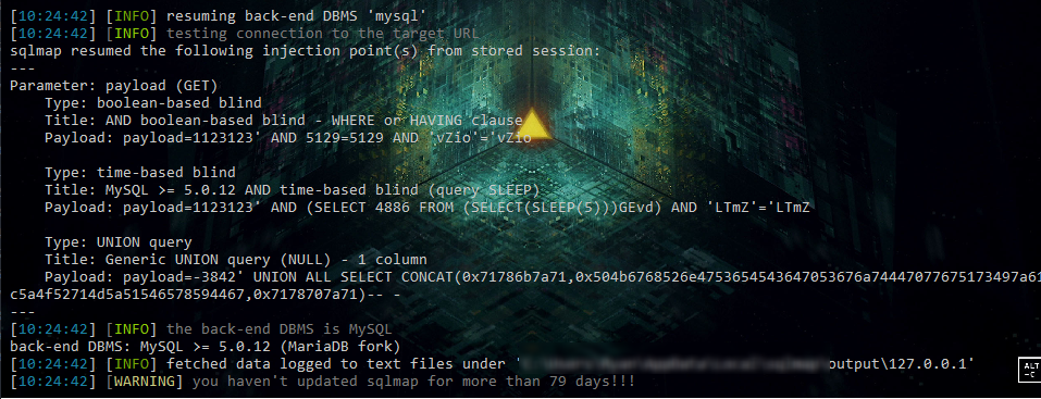 1 | sqlmap -u http://127.0.0.1:5000/?payload=1 |