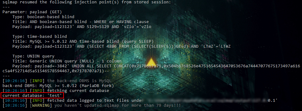 1 | sqlmap -u http://127.0.0.1:5000/?payload=1 --current-db |