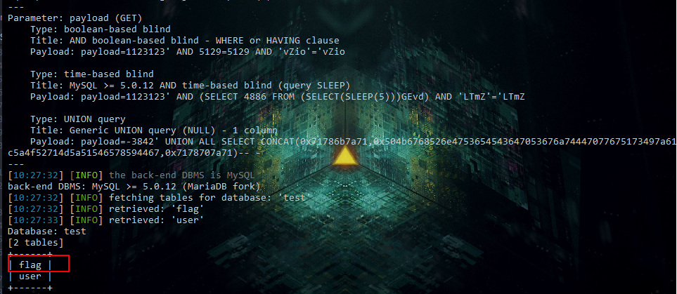 1 | sqlmap -u http://127.0.0.1:5000/?payload=1 -D test --tables |