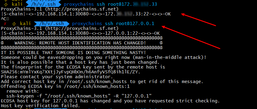经过实践发现,通过代理连接目标主机的内网ip 172.xx.xx.33连接不上,而连接127.0.0.1时则提示主机指纹改变的问题,需要重新写入指纹到目标主机才能连接,然而非root用户无法写入,连接127.0.0.2则完美避开问题