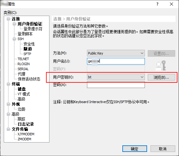 配置用户名及公钥连接,公钥选择前面生成那个