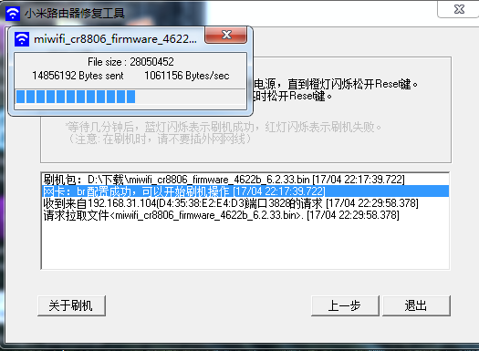 然后电脑就会自动识别到路由器开始刷入。