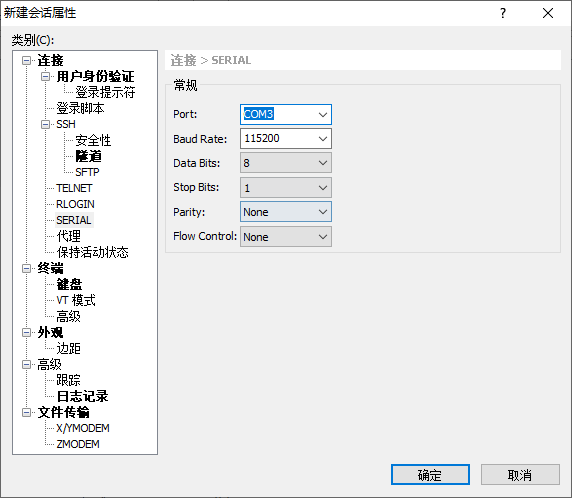 然后TTL模块插入电脑,通过设备管理器找到模块在哪个COM口,这里是COM3。使用终端工具连接,这里使用Xshell,波特率设置为115200,然后连接该COM口。