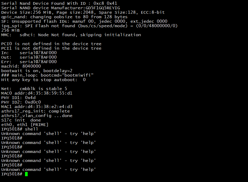 然后接上路由器电源,终端开始输出字符,迅速按几下回车键,就可以进入shell。