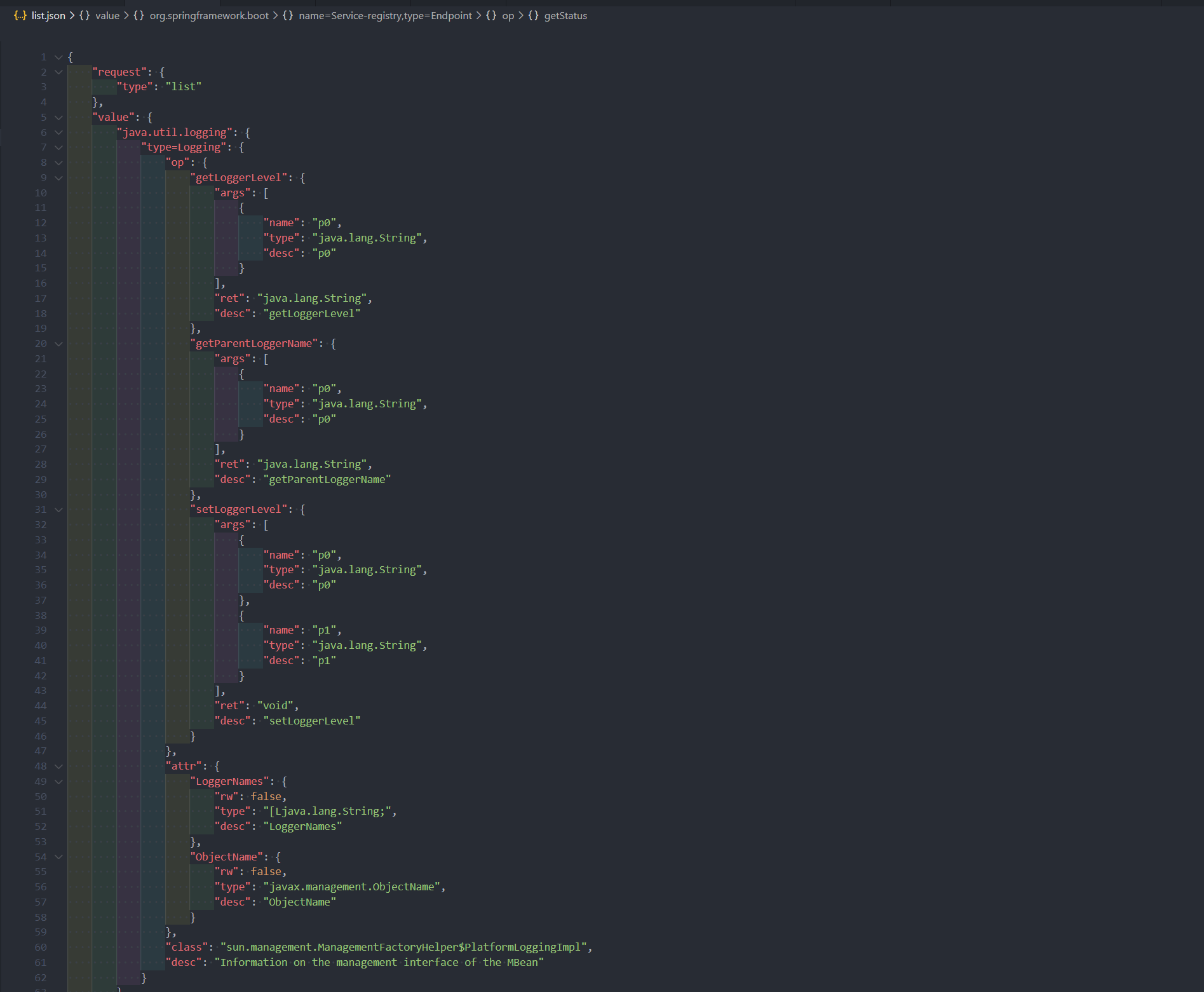 | 1 | /actuator/jolokia/read/java.util.logging:type=Logging/LoggerNames |