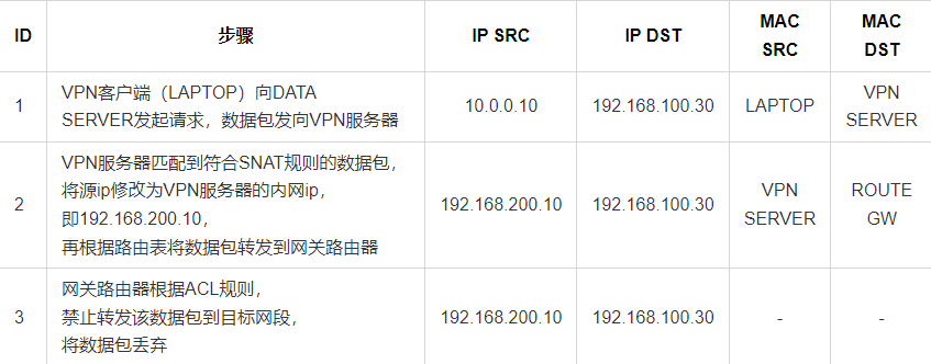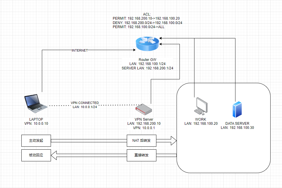 经过上面的规则设置,内网设备与VPN客户端已经可以实现双方ip的直接互访。但是问题也随之出现,考虑到安全问题,我需要设置ACL规则限制VPN客户端的访问范围,原本的方式只需要对VPN服务器的ip地址做ACL限制就行了,现在还需要在VPN服务器规则的基础上加入VPN客户端网段的限制,需要考虑和改动的规则更多了,一一改动显然是不够优雅的,而且也可能导致安全隐患(绕过ACL访问到内网设备)。